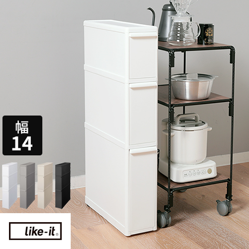キッチンやサニタリー、リビングで使える「like-it(ライクイット)」の引き出しストッカー「スリムストレージ」です。ファイントールストッカーはちょっとした隙間にも収まりやすい幅14cm。スリムながら高さと奥行があり、3段式なので収納力は抜群。使いやすさにこだわった機能で出し入れがしやすいのもポイントです。 【サイズ(約)】 幅14×高さ82×奥行46.5cm 引き出し内寸:上段幅9.8×高さ15.2×奥行42.9cm、中段幅9.8×高さ21.6×奥行42.9cm、下段幅9.8×高さ30×奥行42.9cm 【重量(約)】 3.9kg 【材質】 ポリプロピレン 【生産国】 日本 【備考】 ※耐荷重:引き出し1つ当たり 上段・中段/5kg、下段/10kg、天板/2.5kg ※キャスター、アジャスター(別売り)取り付け可能