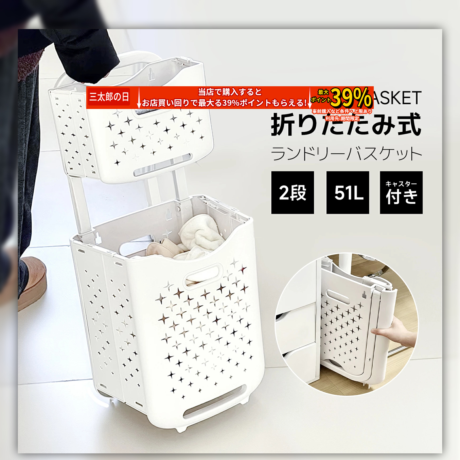 【耐久性&省スペース】 洗濯カゴは高品質のPP+ABS素材で作られて、優れな耐久性を持ちます。スリム設計で洗面所などの限られたスペースを有効に活用できます。 【DIY自由に組み合バスケット】 取り外せ可能な独立型バスケットがあり、取り外し可能な独立したバスケットがあり、自由に組み合わせてDIYで使用できます。上層はバスルームやバルコニーの壁に掛けるなど、単独で使用できます。 【大容量&移動便利】 上下2段のバスケットに洗濯物を分類、バスケットには着替えやタオルなどを収納でき、上部トレーにはボディーソープ、洗面料等を収納でき、キッチン、リビングも使えます。普段でよく使う小物などの収納も大活躍です! 【通気性抜群】 バスケットは水に強くPP素材で作られ、本体に複数の通気穴で湿気がこもりにくく、カビや嫌なニオイの発生を防ぎます。細菌を繁殖させません。 【キャスター付き&移動便利】 360度自由移動可能キャスターで洗濯時には自分の好みの位置に簡単に移動出来ます。
