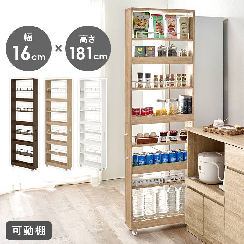 ■商品説明 ●20cm以下のわずかな隙間に収まるスリムなワゴンラック。 ●オープンタイプなので必要な時に取り出しやすく、キッチンやランドリースペースで活躍します。 ●背が高いので調味料やスパイスなど大容量の収納が可能です。 ●取っ手とキャスター付きで出し入れもスムーズ ●両側から取り出せるオープン仕様で場所を選ばず設置が可能 ●1cmピッチで調節できる可動棚で収納物に合わせて自由に高さを変えられます。 ●全ての棚に落下防止の転び止め付きです。 ■商品詳細 カラー:ブラウン、ナチュラル、ホワイト 生産地:マレーシア製 サイズ(約):幅16×奥行55(取手含む:58)×高さ181cm 素材:主材:プリント紙化粧パーティクルボード 組立:お客様組み立て式 備考:キャスター付き、可動棚×4枚