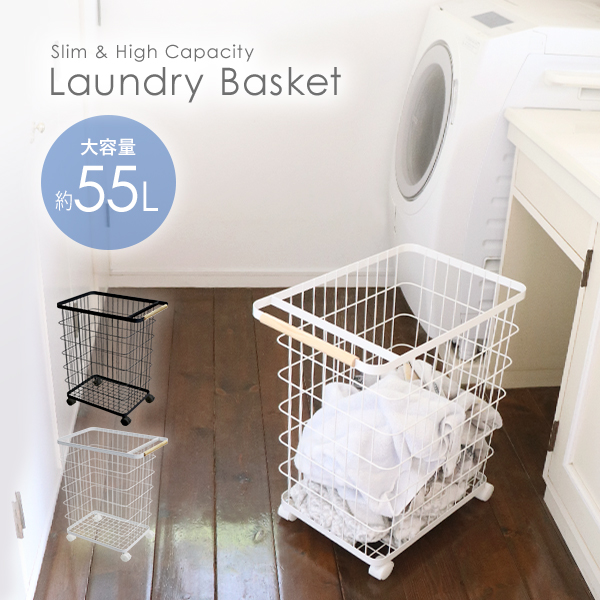 ■ランドリーバスケット ランドリーワゴン キャスター付き ハイタイプ スリム 大容量 約55L 持ち手 持ち運び 軽量 ランドリー ワイヤー ボ