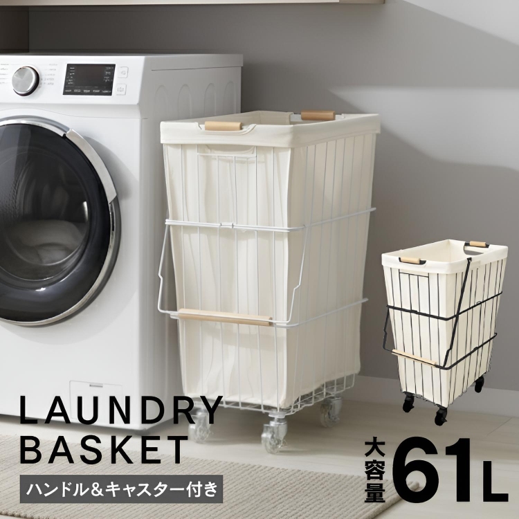 ■ランドリーバスケット スリム キャスター付き 大容量 61L おしゃれ ワイヤー 取っ手 洗濯カゴ ランドリーワゴン バスケット ランドリー