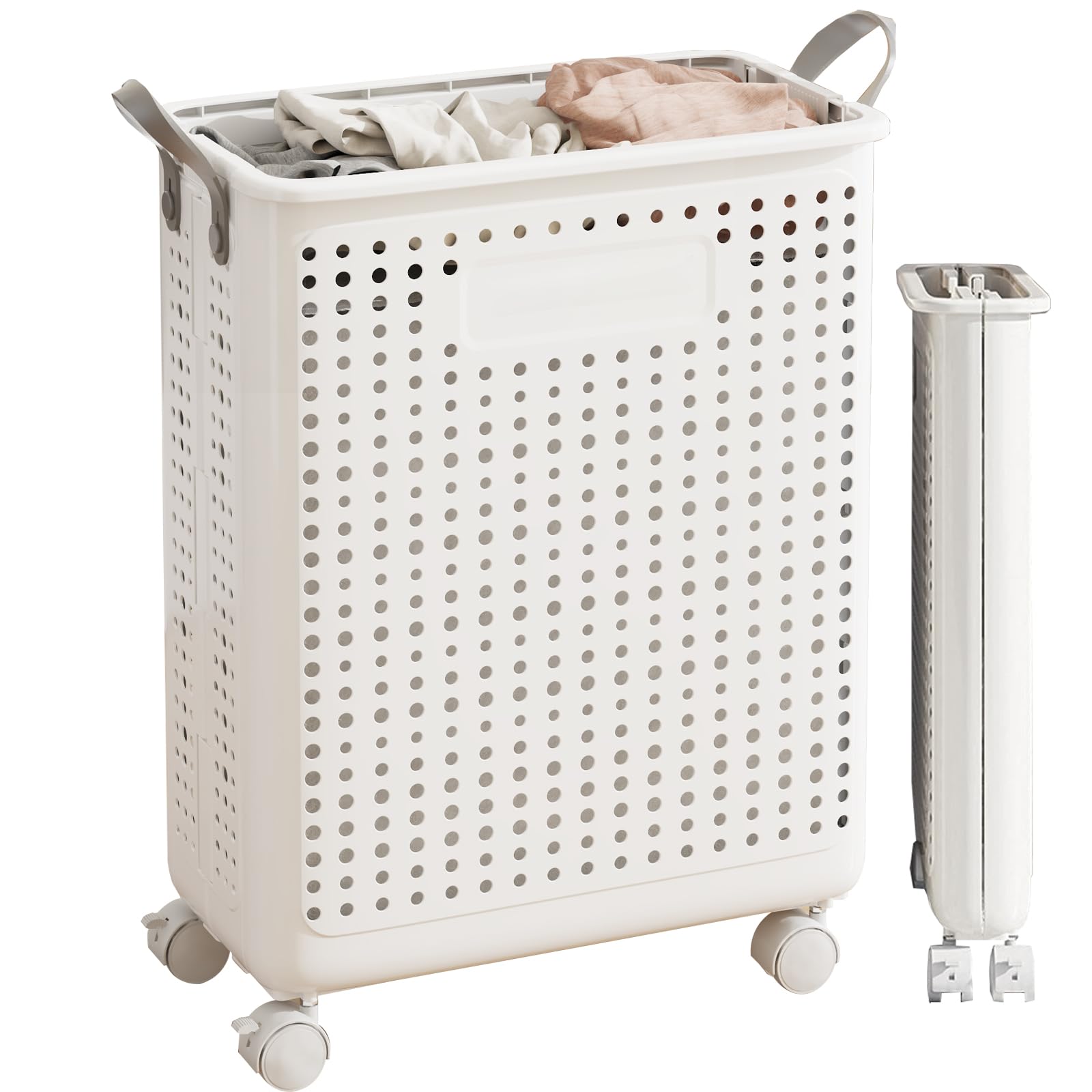 ■LongYi 洗濯かご ランドリー バスケット 折り畳み スリム 洗濯カゴ 折りたたみ 洗濯籠 折畳み キャスター付き 取っ手付き 大容量 ランド
