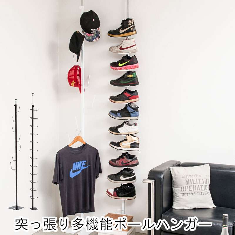 トレイとフックがついた突っ張りラック。これ一つで「掛ける」「置く」ができるので、散らかる服や小物をひとまとめにできます。スリムで場所を取らないのでリビングやダイニング、寝室や子供部屋はもちろん、玄関やトイレにも設置できます。壁や天井に穴を開けずに設置できるので、賃貸アパートやマンションの方にもおすすめ。トレイやフックはお好きな位置・順番で固定できます。<使用例>●デスク周りの収納として●コートやワンピースをかけるハンガーラックとして●アクセサリートレイや小物置きとして●玄関に置いてシューズラックや傘立てとして●寝室に置いてサードテーブルとして●植物のディスプレイとしてetc...【商品サイズ(約)】幅43×奥行43×高さ187-264cm【商品重量(約)】1.4kg【梱包サイズ(約)】幅103×奥行26×高さ9cm【材質】フレーム:スチール(表面加工/粉体塗装)棚板:メラミン樹脂化粧繊維板【生産国】中国【備考】・お客様組み立て品(工具付属)※2人以上で組み立てて下さい・トレイやフックの追加販売や別売はありません