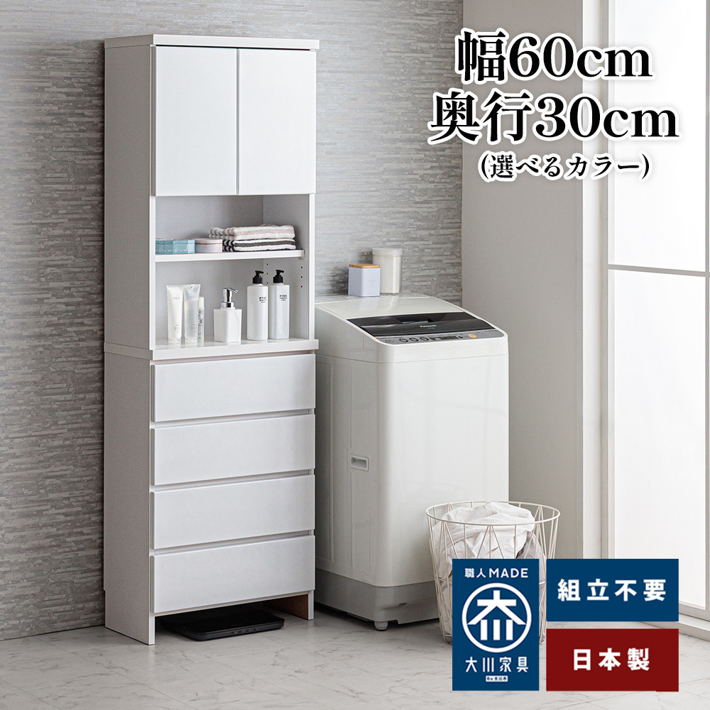 ■ハピネス 幅60cm 奥行30cm 高さ180.5cm ランドリー収納 薄型 完成品 【 スリム 食器棚 タオル 洗面所 収納 収納棚 扉付き 引き出し 脱