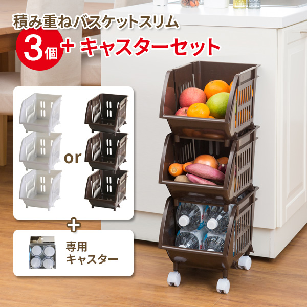 ■積み重ねバスケットスリム×3個 + キャスターセット (Nホワイト / Nブラウン) | バスケット カゴ 重ねて使う 収納 かご 棚 キッチン