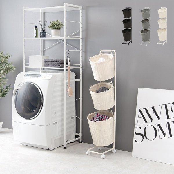 ■ランドリーラック おしゃれ バスケット かご カゴ 3段 丸型 スリム ランドリー収納 キャスター付き 白 ラタン調 収納 洗面所 脱衣所 省ス
