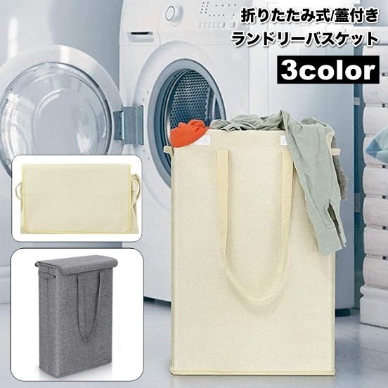 ■ランドリーバスケット 折りたたみ式 蓋付き 持ち手 45L スリム シンプル 脱衣カゴ 衣類 収納 洗濯用品 無地 お洒落 スタ