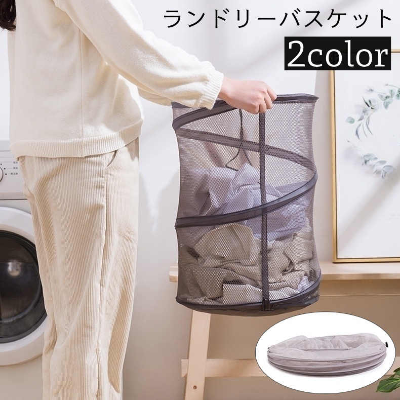 ■ランドリーバスケット 折りたたみ 丸型 ドローコード 洗濯物 カゴ メッシュ 通気性 スリム コンパクト 省スペース 収納 シン