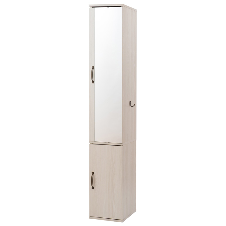 ミラー付きで内部に引出しも付いた機能的ランドリーラック。全身ミラー付きですっきりとしたデザインは清潔感があって、サイズ感もうれしいスリム設計。着替えや洗剤などたっぷり収納できます。扉を開けると引出しもひとつ付いているので、メイク道具などの収納としてもOK。自由に取付できるフックも付属していてドライヤー収納として便利機能もプラス。扉の開閉は組立時に左右どちらにも好みで選べます。一人暮らしなどコンパクトに使えるミラー付きラックは木目の綺麗なホワイト、ナチュラルの2色から商品の仕様/本体:強化プリント紙化粧繊維板、ミラー商品サイズ/本体:(約)幅27×奥行36×高さ165cm扉内寸/(約)幅22.5×奥行32.5(可動棚奥行30)×高さ(上)104(下)45.5cm引出し内寸/(約)幅18×奥行22.5×深さ6.5(有効8)cm棚板/可動式8枚(3.2cmピッチ・上23段階、下7段階)付属品/フック2個耐荷重量/棚板:(約)3kg商品重量/(約)25kg中国製組立品(組立て時間:約45分)商品のお届けの日時指定はできかねます。