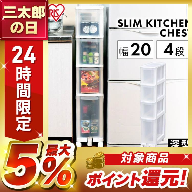 シンク脇や下にちょうどいいサイズ、幅20cmのチェストです。キッチン周りの小物を収納するのに便利です。レトルト食品・500ml缶などが入れられます。また、前倒れを防ぐ転倒防止用のキャスターが付いています。キッチンチェストはこちらキッチンカートはこちらアイリスオーヤマ◆チェスト・引出収納カテゴリ⇒◆チェスト特集⇒