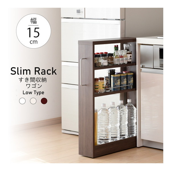 ■隙間収納 幅15cm キャスター付き キッチンワゴン スリム 収納 洗面所 ランドリー 木製 すき間 ワゴン ロータイプ ブラウン