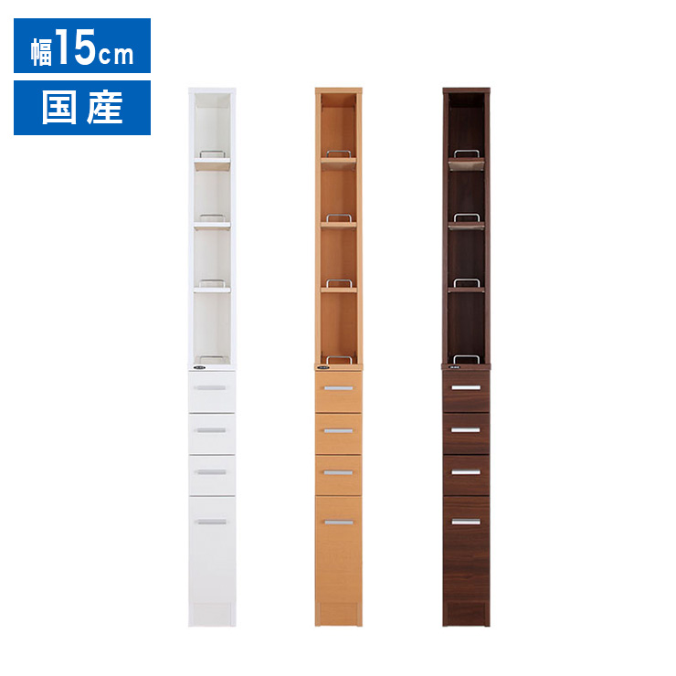 ●外寸幅:15.2cm×奥行き:45cm×高さ:180cm●材質プリント紙化粧繊維板●重量20kg●耐荷重小可動棚板:10kg大可動棚板:10kg小引き出し:5kg大引き出し:5kg●製品状態半完成品※お客様組立部分あり●日本製