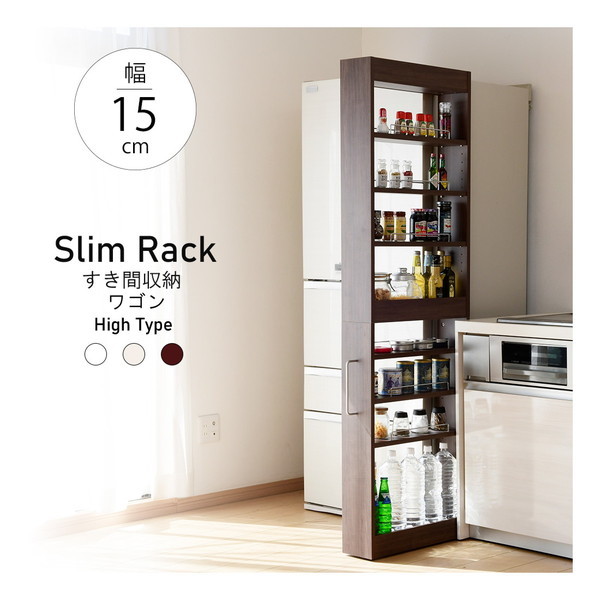 ■隙間収納 幅15cm キャスター付き キッチンワゴン スリム 収納 洗面所 ランドリー 木製 すき間 ワゴン ハイタイプ ブラウン