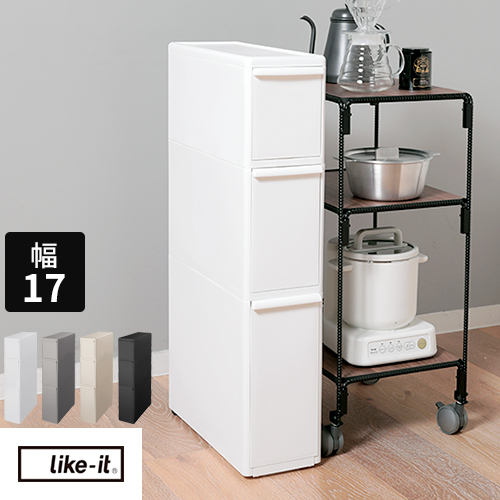 キッチンやサニタリー、リビングで使える「like-it(ライクイット)」の引き出しストッカー「スリムストレージ」です。トールストッカーは、ちょっとした隙間にも収まりやすい幅17cm。スリムながら高さと奥行があり、3段式なので収納力は抜群。使いやすさにこだわった機能で出し入れがしやすいのもポイントです。 【サイズ(約)】 幅17×高さ82×奥行46.5cm 引き出し内寸:上段幅13×高さ16.4×奥行43.4cm、中段幅13×高さ22.3×奥行43.4cm、下段幅13×高さ30.8×奥行40.5cm 【重量(約)】 5.1kg 【材質】 ポリプロピレン 【生産国】 日本 【備考】 ※耐荷重:引き出し1つ当たり 上段・中段/5kg、下段/10kg、天板/2.5kg ※キャスター、アジャスター(別売り)取り付け可能