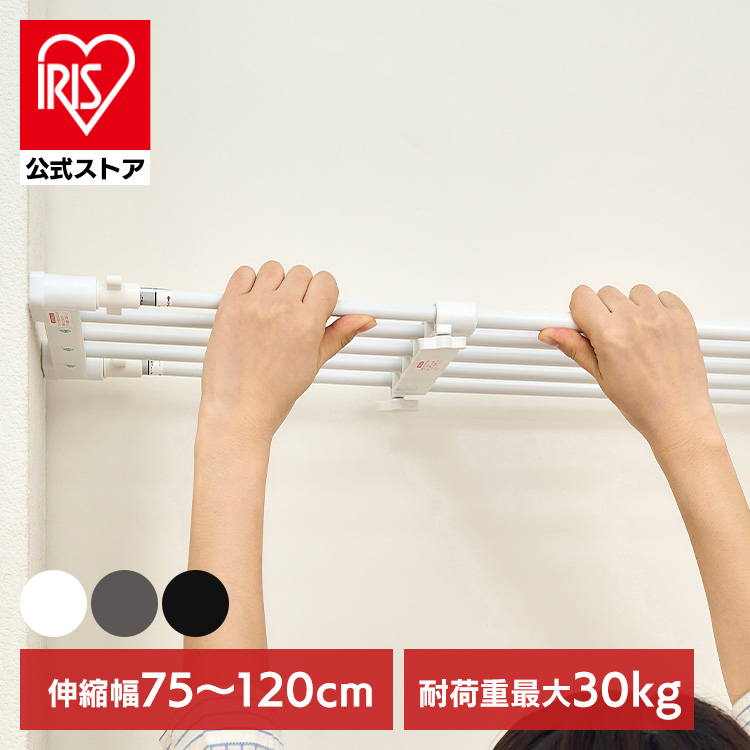 デッドスペースを有効活用!ネジやクギを使わずに壁にしっかり固定。さまざまな場所に取り付けられる、伸縮棚。●商品サイズ(cm)幅約75〜120×奥行約26×高さ約2.2●商品重量約930g●参考耐荷重(取付幅ごと)約75cmの場合(最小幅):約30kg約120cmの場合(最大幅):約15kg※耐荷重は測定値であり、保証値ではありません。●主要材質パイプ:鋼(塩化ビニル樹脂)樹脂部:ポリプロピレン、ABS樹脂、EVA樹脂ねじ類:鋼(めっき)(アイリスオーヤマ)