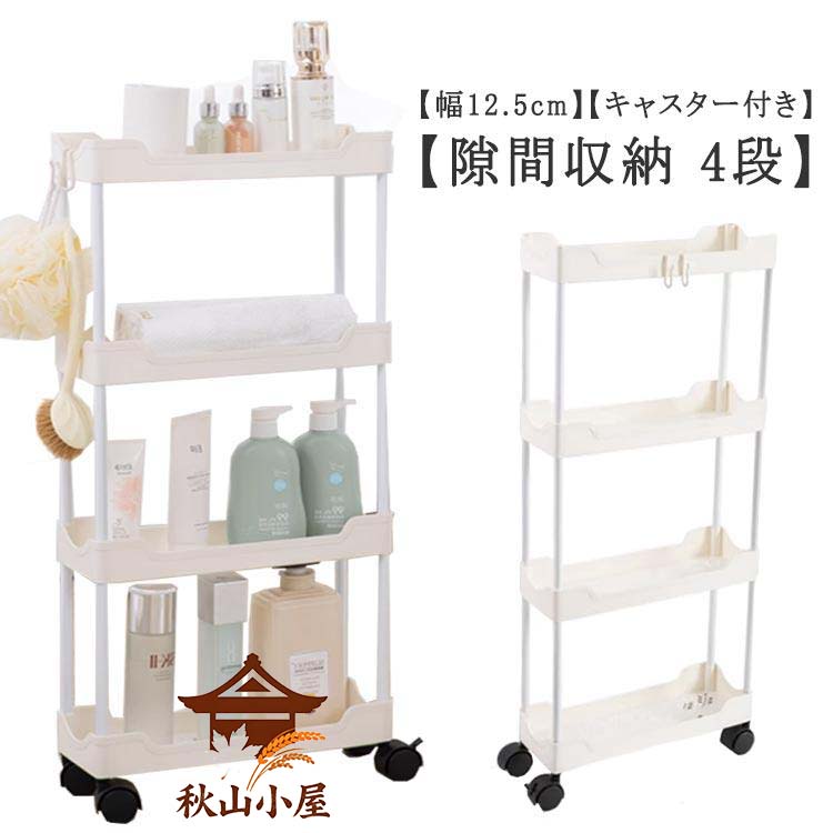 隙間収納 12.5cm 幅 4段 キャスター付き フック付き キッチンワゴン スリム 収納 洗面所 すき間収納 ランドリー ラック 薄型 すき間 キッ