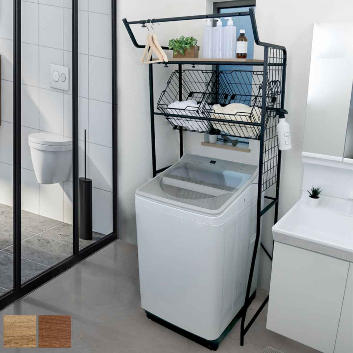 ■ランドリーラック 伸縮 収納 洗濯機 おしゃれ バスケット付き 洗濯用品 カゴ 収納ラック ランドリー ラック 収納棚 棚 洗濯置き場 洗濯機