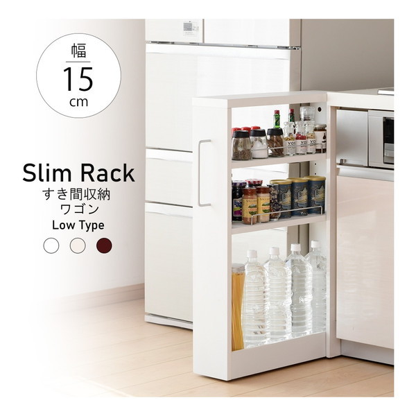 ■隙間収納 幅15cm キャスター付き キッチンワゴン スリム 収納 洗面所 ランドリー 木製 すき間 ワゴン ロータイプ ホワイト 白
