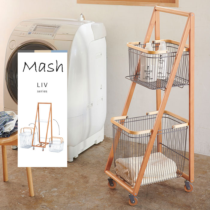 北欧の生活をイメージしたデザインのキャスター付きバスケットワゴンです。キャスターに天然木をあしらい、細部までこだわったシンプルながらかわいいデザイン。深さの異なるバスケットはたっぷりとタオルや衣類等を入れられるのでランドリーシーンに最適です。2段ともカゴの取り外しが可能で、取手付きなので必要なものだけ持ち運びができます。キャスター付きだからお掃除やお部屋の移動もラクラク。