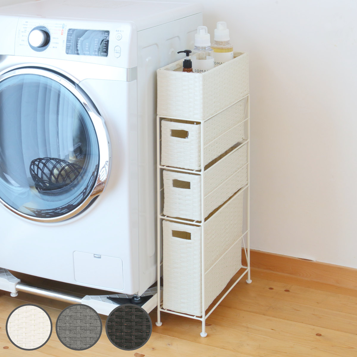 本商品の一部オプションには別途料金が発生します:ホワイト3層(900円) ブラック3層(1100円)?マグネットで簡単設置の洗濯機横収納ラック洗濯機の横にマグネットで簡単に取り付けできる便利な収納ラックです。洗濯用品や掃除用品?バスグッズまで、水回りのものをまとめて収納でき、洗濯機周りをすっきり整頓します。シンプルなモノトーンカラーは、ランドリールームをスタイリッシュな雰囲気にしてくれます。?引き出しで洗濯に使えるものを簡単に出し入れできるラック上段には洗剤や柔軟剤などがスッキリ収まります。頻度の高いものを置くことでサッと出し入れができ、毎日のお洗濯タイムを快適に過ごせます。?スリムな奥行で隙間収納に適15.5cmのスリムな奥行きで、洗濯機横のわずかなすき間でたっぷりとした収納場所を確保できます。?強力マグネットでズレにくいマグネットは壁面を傷つけにくく、錆びないラバータイプを使用しています。強力なマグネットでズレにくく、貼り付け位置の調節も簡単です。