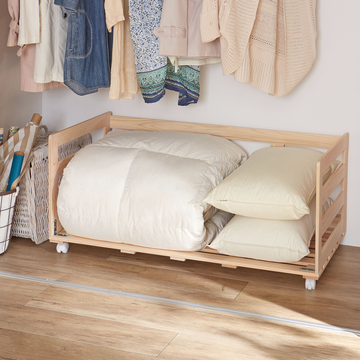国産ひのきを使用し、日本で製作された収納ワゴン表面に節が少ない美しい木目は、上質のひのきを使っている証拠ですまた、丈夫で耐湿性に優れたひのきをすのこ状に仕上げることで、通気性を良くし布団を湿気から守りますクローゼットの空きスペースを生かせるよう、奥行のサイズを設定キャスターが付いているので出し入れもスムーズですしっかりとした作りは日本製ならでは幅は「80cm」と「110cm」の2タイプからお選びください