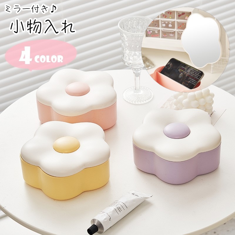 ■小物入れ 卓上ミラー 卓上鏡 レディース 女性 収納雑貨 インテリア雑貨 蓋つき 仕切り付き 花型 フラワー ピンク ブルー イ