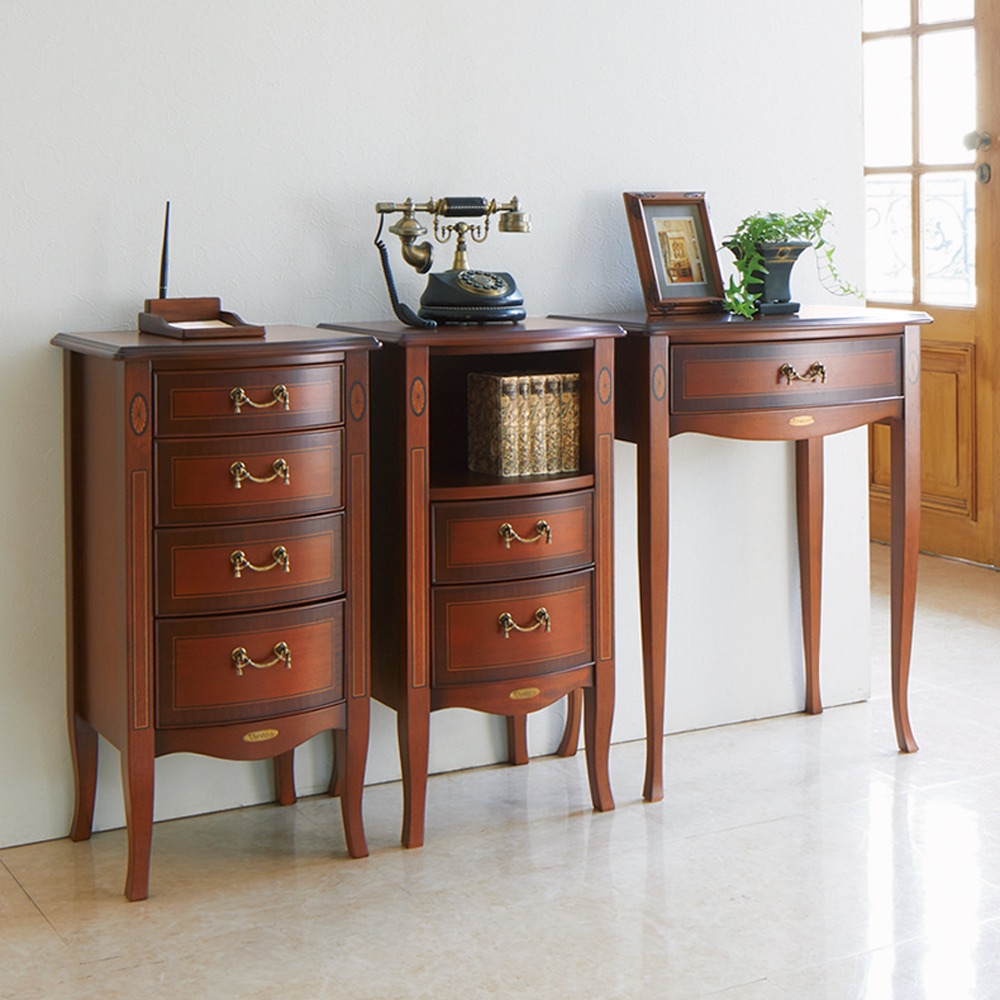 前面を描く繊細な曲線と、緻密な象がん装飾美に彩られたベネチアン調家具。サイズは小さいながらも存在感と高級感漂うコンパクトチェスト。1点置くだけで玄関やリビングの顔になります。