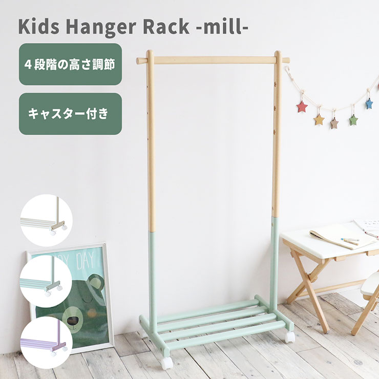 ■キッズハンガーラック mill 3色対応 ハンガー ハンガーラック キャスター付き 高さ調節 棚板 収納棚 子供用 コートかけ 洋服掛け 帽子掛