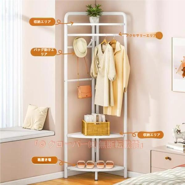 コートや洋服などをかけたり、帽子やバッグなどをかけたり、収納ケースや靴、バッグ、タオルなど、さまざまな小物を収納できる収納デザインが豊富なハンガーラック。コーナースペースを最大限に活用できます。 フレームは防水加工を施した高強度ステンレス鋼管を採用し、耐錆性、耐摩耗性に優れています。太いチューブはしっかりと安定し、最大耐荷重は35kg以上です。また、日常生活でのお手入れも簡単です。 サイズ:幅37奥行37*高さ174cm、材質:ステンレス鋼管、耐荷重:約35kg、組み立て:必要。また、引っ越しの際に簡単に分解してコンパクトに梱包できるので、新築マンションでも再利用できます。 スペースのコーナーに対応したハンガーです。コンパクトで、床面積が0.1m2未満なので、玄関、リビング、寝室、更衣室などに置いて、コーナースペースを有効活用します。 工具は必要なし!ネジ、クギは使わず、パイプと各パーツを差し込んでだけで完成する簡単組み立て設計。一人でも簡単に組立できます。