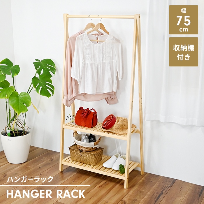 ■ハンガーラック 木製 幅75 棚付き 2段 天然木 コートハンガー 洋服掛け 省スペース コンパクト ナチュラル おしゃれ 収納