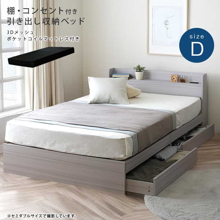 美しいシンプルフォルムの実用的な多機能ベッド シンプルなデザインでも実用的な多機能をしっかり備えたベッドフレームです。 2杯の引き出しでたっぷりと収納でき、デッドスペースになりがちなベッド下を有効活用できます。 棚部分にはコンセントが付いており、枕元でのスマホやタブレットの充電に便利です。 メガネや目覚まし時計などの小物を置くことも可能です。 ホワイト、ブラック、ウォールナット、ナチュラルに加え ・ベージュ ・ダークブラウン ・ダークグレー ・ライトグレー の4色が新登場! サイド+表面が3Dメッシュ生地仕様で通気性に優れた ポケットコイルマットレス【ブラック(やや硬め)】セットのページです。