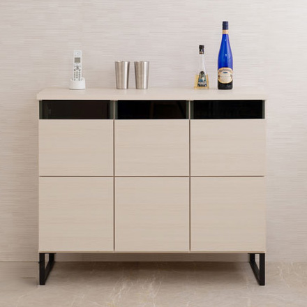 ■商品について/モノトーンカラーで仕上げたスクエアキャビネットはスチール脚との融合で存在感ありながらも軽やかでスタイリッシュな印象。細脚からどっしりとしたボディで完成されたスクエア感は直線的でリビングや壁面に溶け込み一体感が生まれるデザイン。扉・引出しというシンプルな構成でありながら収納力は十分。上部にブラックガラスのラインを入れることでメリハリ感、異素材の存在感でリビング空間をカッコよく演出します。ソリッドブラックな脚部やガラス、上品な木目の効いた表面材が絶妙なバランス。全て取っ手を排除し、デザインを損なわず開閉できる高度なプッシュ式を採用。脚部は外側にしたり内側にしたりとチェンジできます。■商品の仕様/前板・天板・ブラック内張り:強化プリント紙化粧繊維板、その他:プリント紙化粧繊維板、脚部:スチール、強化ガラス■商品サイズ/本体:(約)幅106×奥行43×高さ89.5(脚15含む)cm■扉内寸/(約)幅29×奥行38.5×高さ34cm■耐荷重量/天板:(約)20kg、収納棚:(約)10kg■商品重量:(約)29kg■日本製■完成品(脚部のみ取り付け)