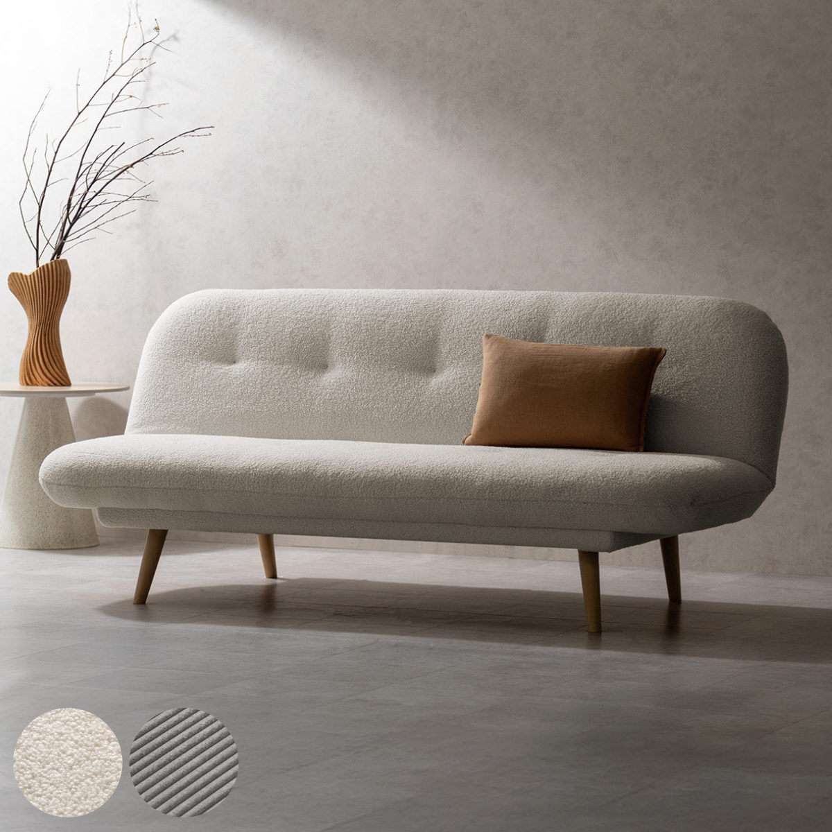 ※北海道、東北、沖縄、離島につきましては別途送料がかかります。ご注文後メールにて金額をお知らせ致します。■サイズソファ時外寸:幅198×奥行86×高さ71cmベッド時外寸:幅198×奥行100×高さ37cm座面幅:178cm座面奥行(ソファ時):64cm座面高:37cm肘高さ:55cm脚高さ:約13.5cm重量:約49kg■材質材質:ファブリック前板:アッシュ材内部構造:Sバネ/ウェービングベルト背・座面構造:ウレタンフォーム■詳細脚部お客様取付けクッション付き脚取外し:可能カバー取外し:不可ボタン止めのアクセントデザインがおしゃれな北欧風ソファベッド。肘掛けの両サイドにはポケット収納付き。※撮影及び表示画面の関係で、実際の色と異なって見える場合がございます。