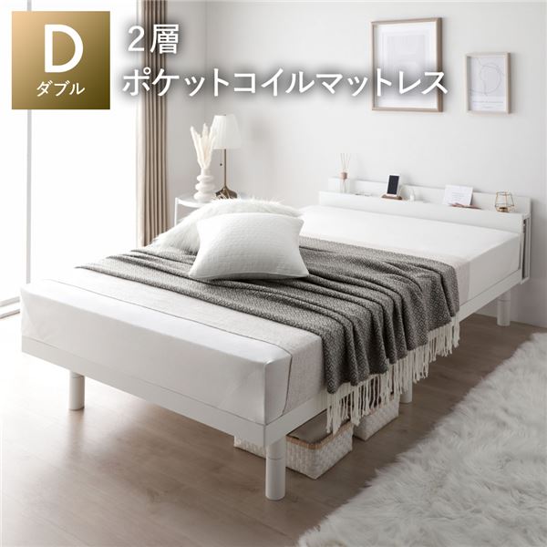■ダブルベッド 白 ホワイト ベッド 2層ポケットコイルマットレス付 白 ホワイト 宮付き 高さ調整 すのこ ベット