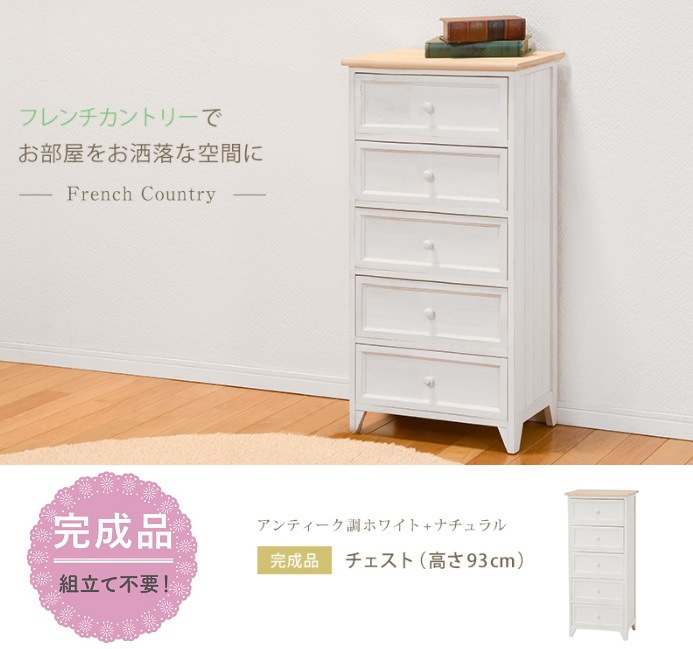 ☆★☆★フレンチカントリーシリーズ☆★☆★清潔感のあるホワイトインテリア。味わいのある木目が可愛いアンティーク調チェスト!アンティーク加工、ノスタルジックなシャビー感で空間を可愛らしく演出してくれます。ベッドサイド、リビングやお部屋の小物入れとして、かわいいサイズなので重宝します。・ …-………--★★●商品詳細情報・サイズ 幅41×奥行31×高さ93cm ・引出し内寸 約)幅32×奥行23×高さ13.5cm・素 材 主材:桐材・仕 様 5段/引出し5杯・生産国 中国■完成品■メーカー直送■アンティーク仕様について アティーク調の塗装は一品一品手作業で、程よく使い古したような風合いを表現しております為、塗装の色や風合いが異なり濃淡・かすれは不良ではなくこの手法の特徴です。使い始めに研磨した白い粉が付く場合もございますが乾拭きをしていただければ大丈夫です。その点をご理解いただきますようお願い致します。