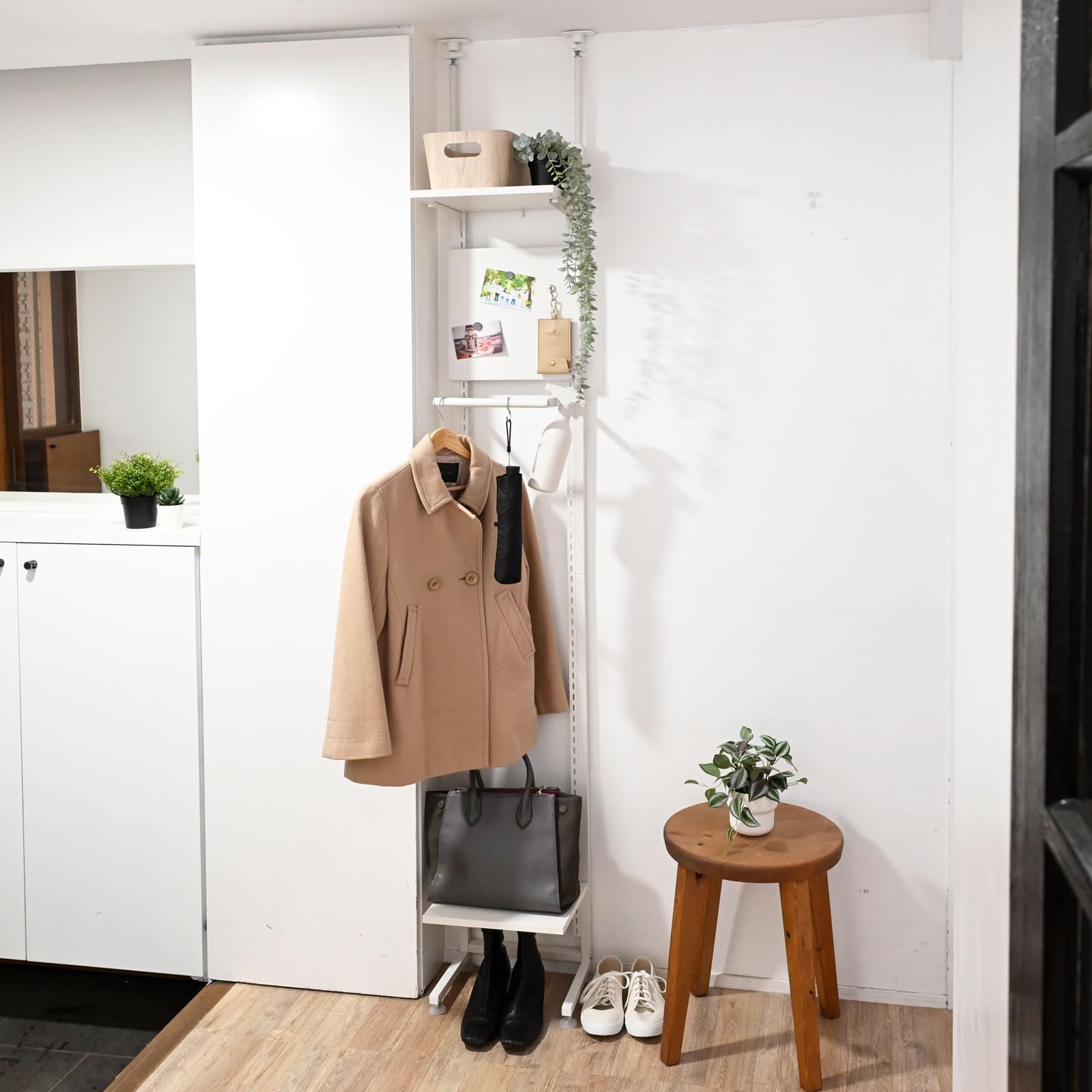 ◆商品名:山善 突っ張り ラック ハンガーラック スリム 玄関 収納 省スペース (棚/パネル/ハンガーバー付) マグネット使用可 幅32×奥行28×高さ