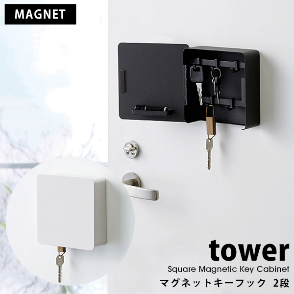 ■ブランド tower【タワー】 ■商品名 Square Magnetic Key Cabinet (マグネットキーフック2段) マグネット 扉付き 壁掛け キーボックス ■商品紹介 マグネットでドアにくっつくキーボックス。 玄関にごちゃつく鍵をひとまとめに、扉付きで見た目もスッキリ収納。 サッと出したい印鑑も、内側のトレーに置けてとても便利です。 ■サイズ (約)幅15.8cm×奥行5.5cm×高さ15.8cm ■素材 扉・本体:スチール(粉体塗装)、マグネット フック:ABS樹脂 ■耐荷重 (約)1kg ■内寸 (約)幅14.8cm×奥行5cm 上部バーと下部バーの距離:(約)6.2cm ■付属品 木ネジ×2
