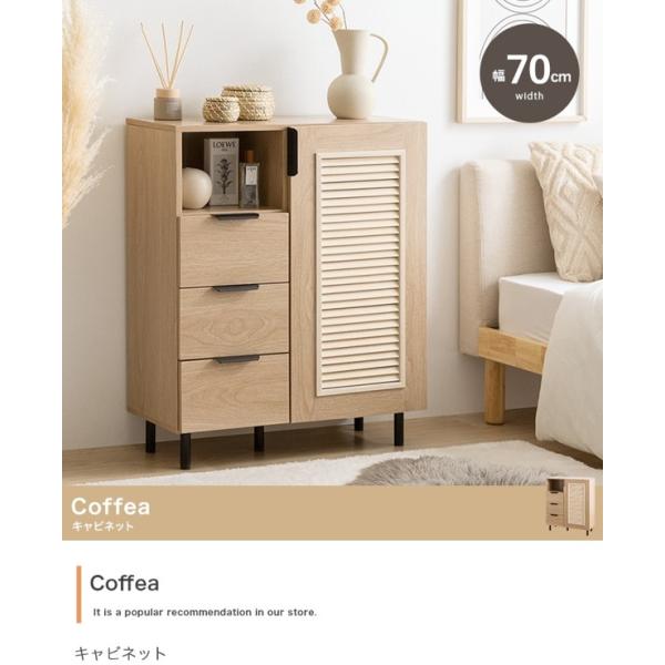 ナチュラルな木目にルーバーデザインをさりげなくあしらった『Coffea(コフェア)』シリーズのキャビネット。ルーバー扉は目隠しをしながら通気性も確保し、さらにお部屋の抜け感も演出。扉収納と引き出し収納、オープン収納を兼ね備えているので、隠す収納と見せる収納が1台で実現。また、コンパクトで置きやすく、ワンルームや一人暮らしの方にもおすすめです。配達業者を指定いただくことはできません。沖縄・離島に関しましては、別途配送料が必要となります。北海道への配送も別途配送料が必要になる場合がございます。※別途送料が発生する場合は後ほどご連絡させていただきます。タイミングによっては在庫切れの場合があります。