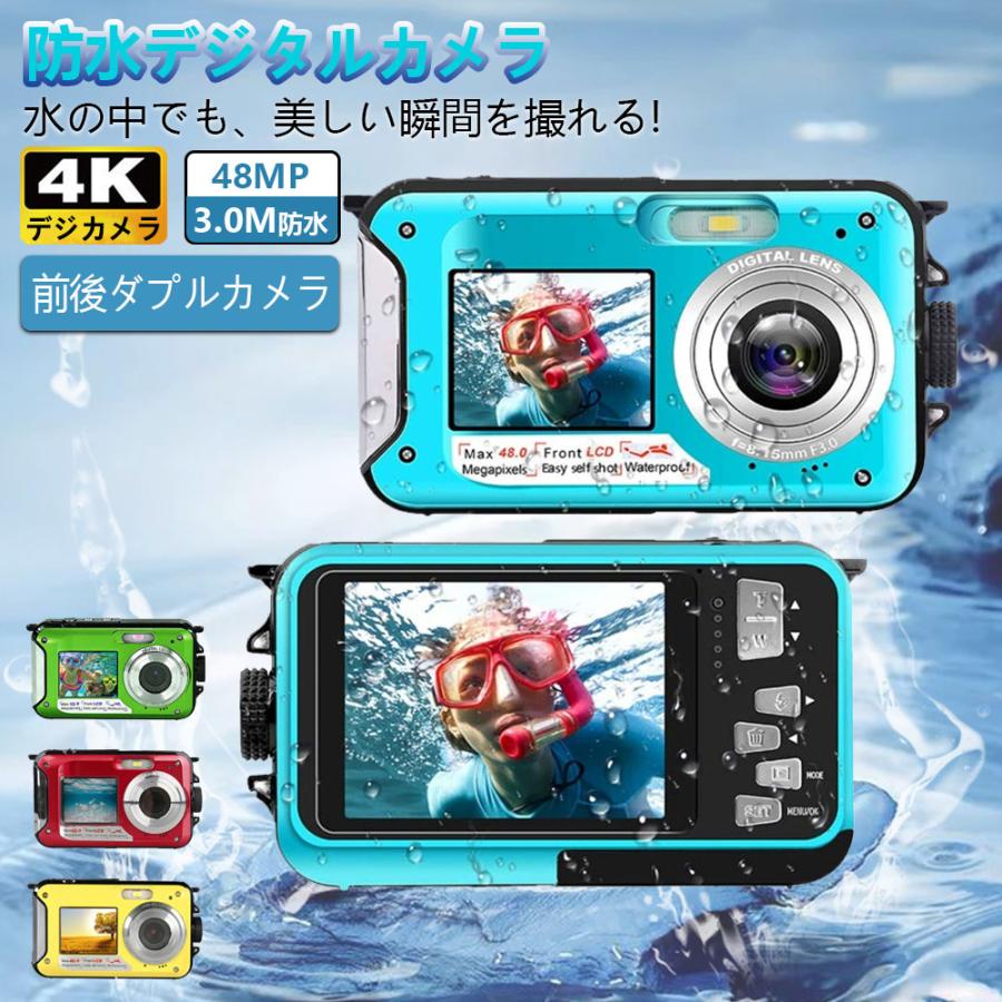 防水デジタルカメラ デジカメ 3M防水 4800万画素 4K 前後ダブルカメラ 16倍ズーム 2.7インチ大画面 自撮り 手ブレ補正 水中カメラ 防水カメラ 旅行 プレゼント