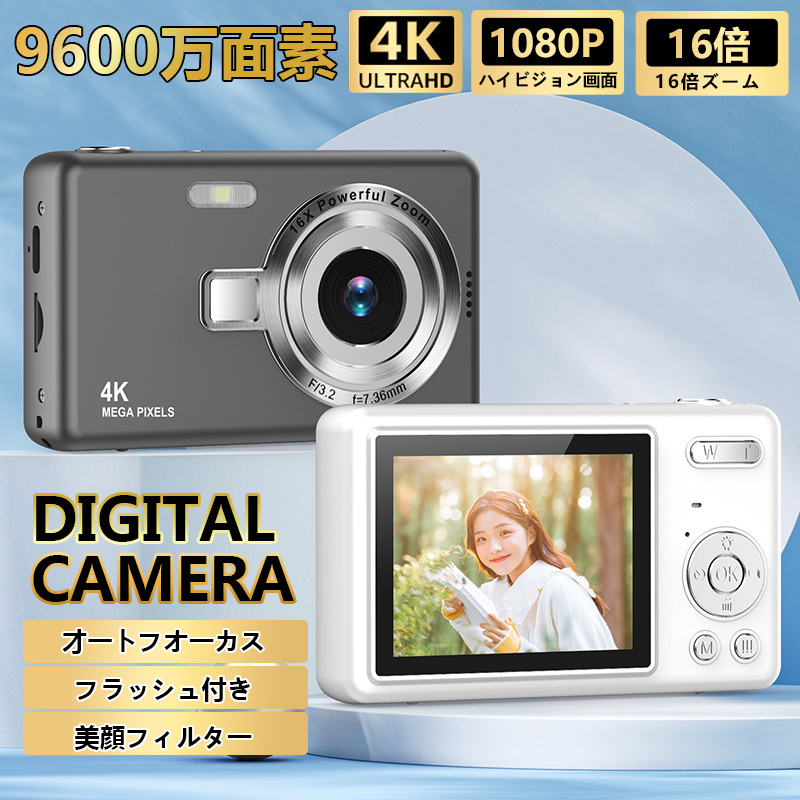 ■デジカメ デジタルカメラ 4K 9600万画素 16倍ズーム 高画質 オートフォーカス ウェブカメラ機能 手振れ補正 IPS大画面 軽量 防塵 撮影