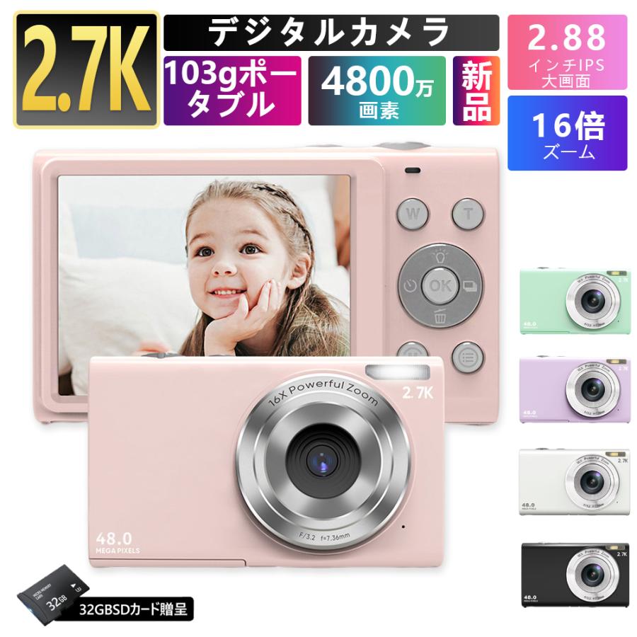 「4800万画素・2.7Kビデオ解像度」大人顔負けの高性能!鮮明な画面を通じて気になる瞬間を全部記録します。さらに、ビデオ解像度は(2.7K・1080P・720P・VGA)自由設定されます。「2.88HD大画面」IPSカラースクリーンを搭載し、大画面で景色の美しさをそのまま表現、目の疲れも軽減します。子供たちにカメラの魅カを感じさせ、幸せな時間を作られましょいう。「AFオートフォーカス・手振れ補正」AFオートフォーカスと電子防振機能により、画像の安定性を高めることができて、浅く押してピント合わせだけで、子供も手振れを心配なし、より高品質の写真を撮れます。「多機能 & 豊富な撮影モード」顔検出、連続撮影、スマイルショット、ビューティファンクション、セルフタイマー、ワイトバランス、自動オフ、日付/時間表示などが設定でき、豊富な機能が持っているデジカメです。多種フィルタを搭載して、家族写真、運動会、卒業式、忘年会、旅行、イベント、いろいろな場合で大活躍します。*日本語の説明書付き