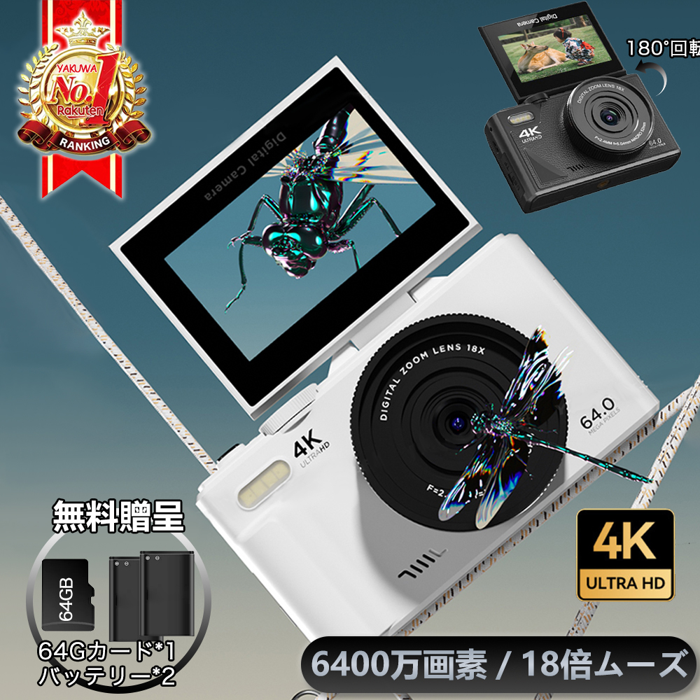 ■「au pay 1位」2025新作 デジカメ 5K 7500万画素 18倍ズーム 180°回転 3.0インチ AF機能 手ブレ補正 携帯便利 USB-C充電 専門家 コンパ