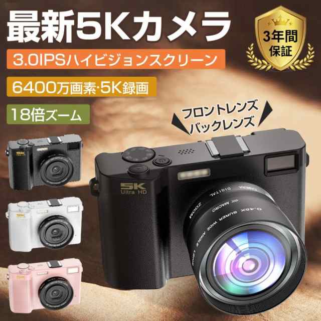 デジタルカメラ WIFI機能 5K デジカメ スマホに送れる 6400万画素 デュアルレンズ 64GBマイクロSDカード付き 18倍デジタルズーム オートフォーカス機能 手振れ補正 ウェブカメラ 自撮り便利 3インチ大画面