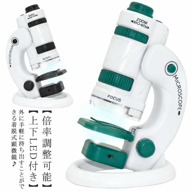 顕微鏡 子供用 ミニ顕微鏡セット ハンディ顕微鏡 ポータブル顕微鏡 60?180倍 台座着脱可能 子供用 人気 小型 おでかけ顕微鏡 スマホ撮影可能 スマホアダプター付 上下LEDライト 標本/スライドガラス2枚 ストラップ付き 学習用 初心者