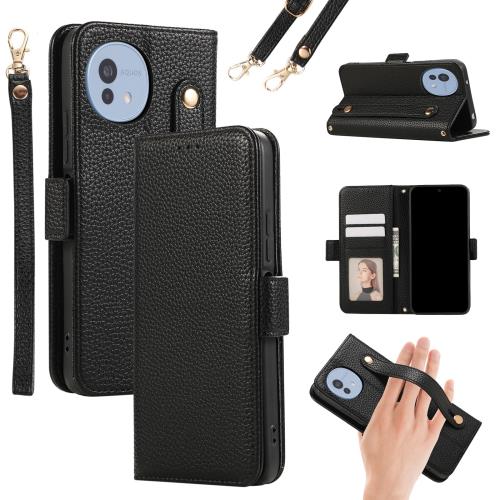 Aquos wish 4 ケース 手帳型 おしゃれ シャープ アクオス ウッシュ4 スマホショルダー 肩掛け 携帯ケース 片手操作 グリップループ付 落下防止 サイドマグネット SH-52E 財布型 カバー カードポケット付き 402SH カバー aquos 全面保護 wish4 携帯カバー カード収納 横置きスタンド機能 PUレザー (ブラック, AQUOS wish4)