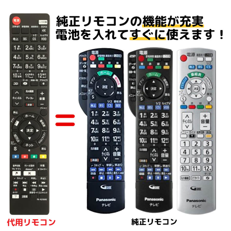 ・パナソニック用の「代用リモコン」です。 ・純正リモコンと同じ機能ボタンで、主な機能は全て使用できます。 ・設定不要で、電池を入れればすぐに使用できます。 ・汎用、マルチリモコンでは使えない機能もご使用いただけます。 ・電池は別売りです。 ・リモコンのボタン機能がテレビにない場合やテレビの機能がボタンとして設置されていない場合は操作ができかねます。 対応リモコン N2QAYB000848 N2QAYB000569 N2QAYB001228 N2QAYB001016 N2QAYB000847 N2QBYB000045 N2QBYB000042 N2QBYB000052 ※マイクボタン 非対応 N2QAYB000484 ※SDカードボタン 非対応 N2QAYB000537 左右入換 右画面操作ボタン 非対応 N2QAYB000545 SDカードボタン ドライブ切換 左右入換 右画面操作ボタン 非対応 N2QAYB000733 N2QAYB000732 左右入換 右画面操作 エコ視聴 お好み選局ボタン 非対応 N2QAYB0