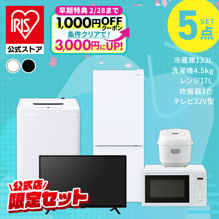 ■家電セット 5点セット 冷蔵庫 133L 洗濯機 5kg 電子レンジ 炊飯器 3合 液晶テレビ テレビ アイリスオーヤマ 新生活 安心延長保証対象