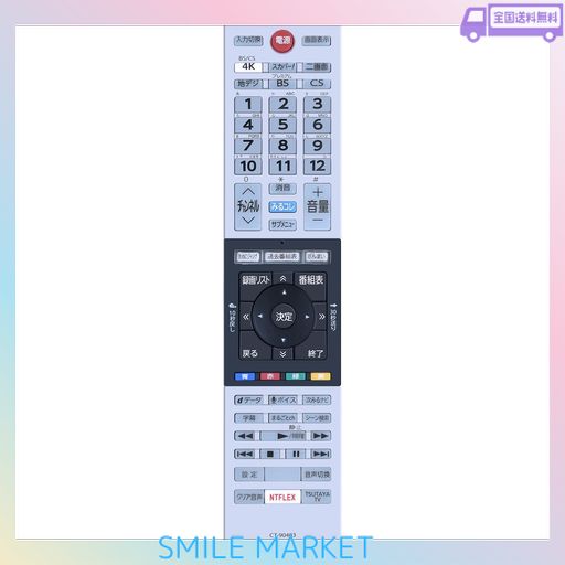・東芝テレビ用の「代用リモコン」です。 ・本リモコンの設定は不要です。電池を入れればすぐに使用できます。 ( 単4電池は別売りです。) ・純正リモコンとボタン配置は違いますが、主な機能は全て使用できます。 ・汎用、マルチリモコンでは使えない機能もご使用いただけます。 対応リモコン CT-90490 55Z740X 65Z740X 77X9400 65X9400 55X9400 48X9400 CT-90483 55X920 65X920 49Z720X 55Z720X 発送方法 ※送料無料。ネコポス(ポスト投函)での発送となります。追跡番号も付きますのでご安心ください。