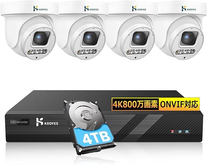 【商品概要】 ブランド:KEOYEE 製品型番:ZS-GQ2 梱包サイズ:38 x 31 x 26 センチメートル、10.5キログラム 色:オフホワイト 材質 :アルミニウム合金 電源:電源不要(POE給電) レーザークラス:双方向通話, 360度PTZ機能, 5倍光学ズーム, 動体検知, 夜間カラー暗視 付属品:防犯カメラ(800万画素)*4、8チャンネルコーダー*1、日本語説明書*1、防犯ステッカー*1、ネジバック*4、マウス*1、4TB HDD*1、レコーダー用電源アダプター*1、LANケーブル(1M)*1、LANケーブル(18M)*2、LANケーブル(30M)*2 年式:2023年 保証:購入後、メーカー2年保証 商品の重量:10.5キログラム