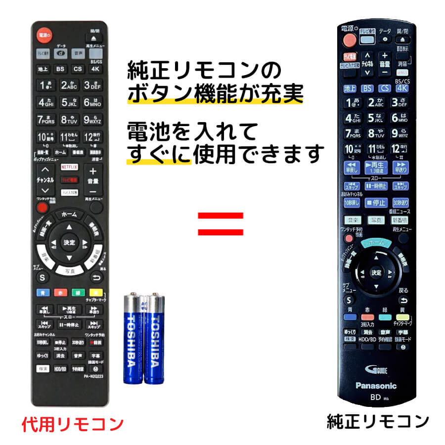 対応リモコン ・純正リモコンに付いているボタンが設置されており、主な機能は全て使用できます。 ・設定不要で、電池を入れればすぐに使用できます。 -リモコンモードを変更されている方は説明書をご参照ください。 -無線方式へ変更されている方は赤外線方式への変更が必要となります。 ・ボタンの配置は多少異なります。 ・マルチリモコンでは使えない機能もご使用いただけます。 ・単4アルカリ乾電池2本付きです。 対応リモコン N2QAYB001223 対応リモコン DMR-SCZ2060 DMR-SUZ2060 DMR-4CT201 DMR-4CT301 DMR-4CT401 DMR-4CW101 DMR-4CW201 DMR-4T201 DMR-4T301 DMR-4T401 DMR-4W101 DMR-4W201 DMR-4CS100 DMR-4CW200 DMR-4CW400 DMR-4S100 DMR-4W100 DMR-4W200 DMR-4W300 DMR-4W400